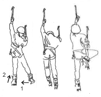 Druhý čakan zasekneme stranou a vyššie. Zavesíme sa krátko na čakan, posunieme panvu pod novú hlavnú ruku aby sme odľahčili pätu a posunieme vyššiu nohu nižšie. Teraz vystúpime tromi krokmi vyššie, pričom posledný krok je väčší a znovu zaujmeme novú základnú polohu (pri poslednom kroku bude päta vo výške