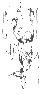 Aj mačky môžeme nasadzovať veľmi rôzne, keď to vyžadujú ťažké skalné úseky môžeme liezť presne tak ako v topánkach. Skôr stúpame na vnútorný alebo vonkajší okraj mačiek ako na predné hroty. V ťažkých skalných úsekoch musíme liezť s otáčaním bokov. Do jemných škár alebo malých dier môžeme s výhodou použiť mačky s jedným predným hrotom (obr. 138).